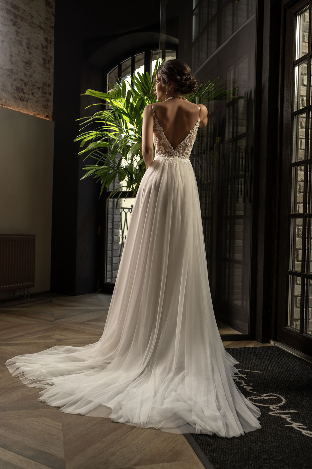 Romantisches A-Linien-Brautkleid mit tiefem V-Ausschnitt, floraler Spitze und fließendem Tüllrock. Tiefer Rücken mit Reißverschluss für modernen Chic und optimalen Tragekomfort.