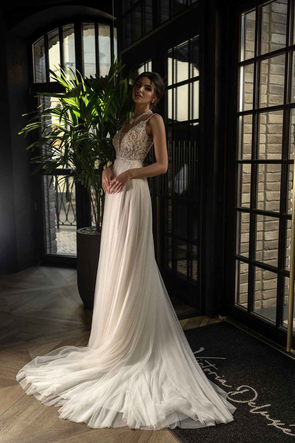Dieses bezaubernde A-Linien-Brautkleid ist ein wahres Highlight für jede Braut, die sich an ihrem Hochzeitstag feminin, elegant und gleichzeitig modern fühlen möchte. Das Kleid kombiniert feinste Spitzenverarbeitung mit einem leichten Tüllrock und einer raffinierten Rückenlösung, die für einen sinnlichen und dennoch stilvollen Auftritt sorgt.