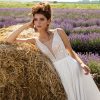 Dieses Kleid lässt sich wunderbar mit zarten Blumenkränzen, dezentem Perlenschmuck oder barfuß auf der Wiese tragen – ein Traum für jede romantische, freie Braut.