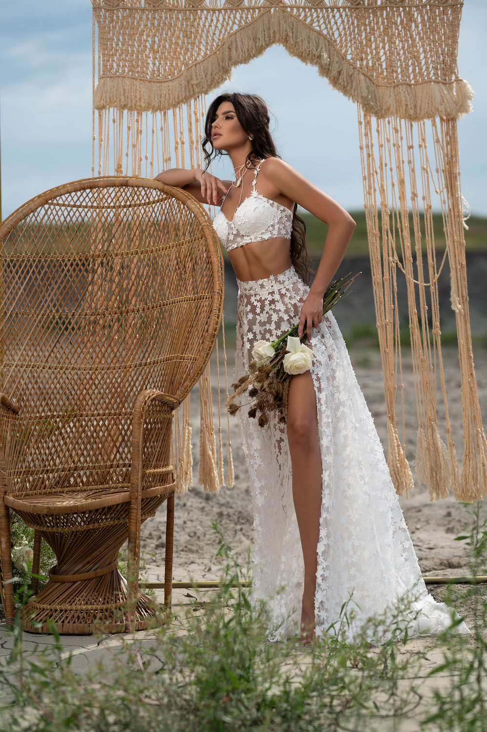Ob mit natürlichem Braut-Make-up, lockerem Haarstyling oder barfuß im Sand – dieses 2-teilige Brautkleid ist Ausdruck von Freiheit, Individualität und moderner Romantik.