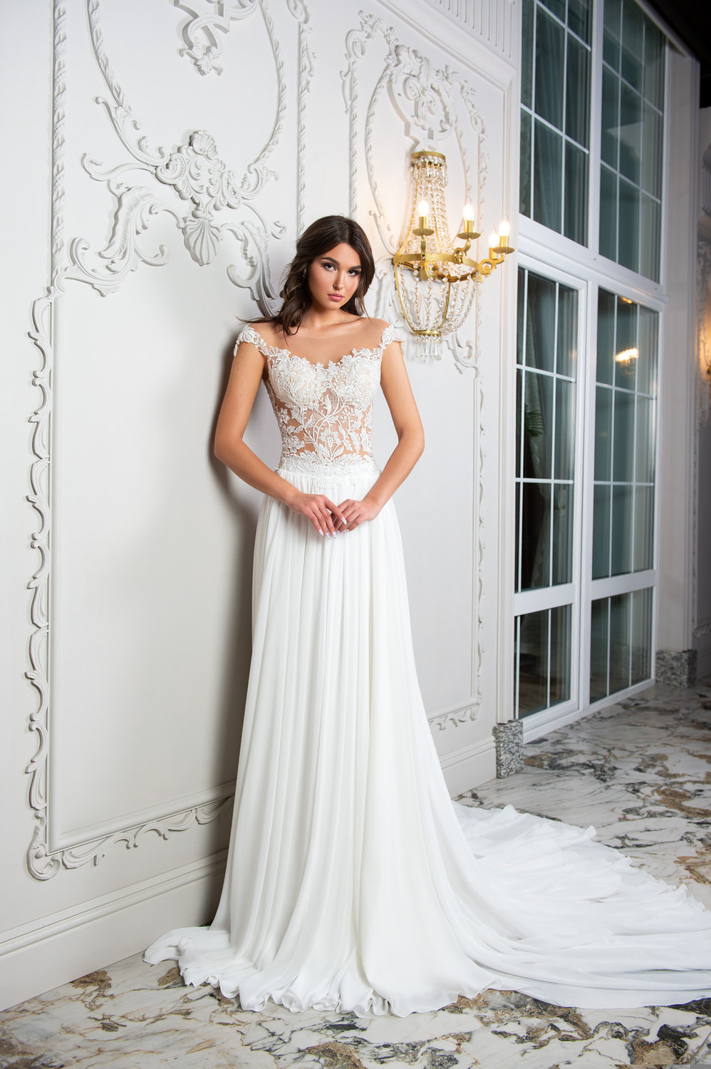 Romantisches A-Linie Brautkleid in Ivory mit floraler Spitze in Tattoooptik, durchsichtiger Korsage, Chiffonrock, langer Schleppe und eleganter Knopfleiste im Rücken.