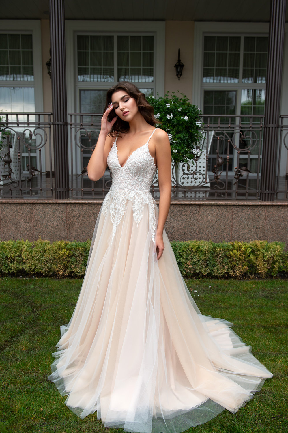 A-Linie Brautkleid in Blush mit floraler Spitze, V-Ausschnitt, Tüllrock und eleganter Schleppe – klassisch, romantisch und modern zugleich.