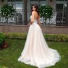 Der mehrlagige Tüllrock sorgt für einen traumhaft leichten Fall und verleiht dem Kleid eine romantisch verspielte Note. Die elegante Schleppe sorgt für einen feierlichen Auftritt und rundet das Gesamtbild perfekt ab – ob auf dem Weg zum Altar oder beim Hochzeitstanz. Die Rückansicht mit dem offenen Rücken bringt ein modernes Detail ins klassische Design und sorgt für einen bleibenden Eindruck.