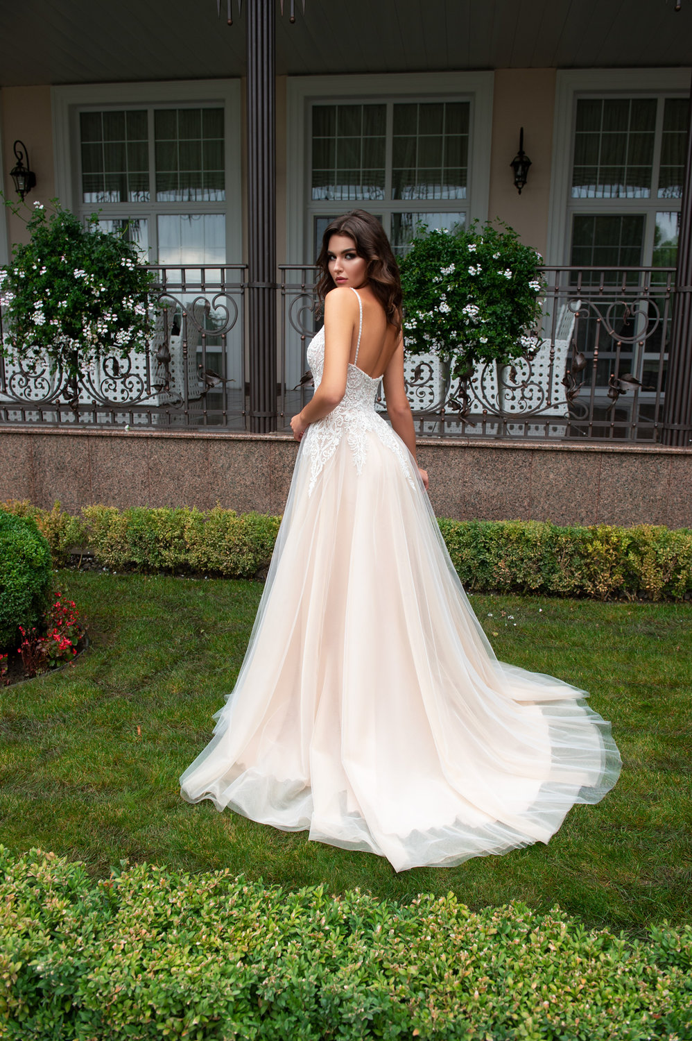 Die Farbe Blush lässt die Spitze besonders edel wirken und schmeichelt jedem Hautton. Dieses A-Linie Brautkleid eignet sich hervorragend für alle Hochzeitsarten – von der eleganten Schlosshochzeit bis zur freien Trauung im Grünen.