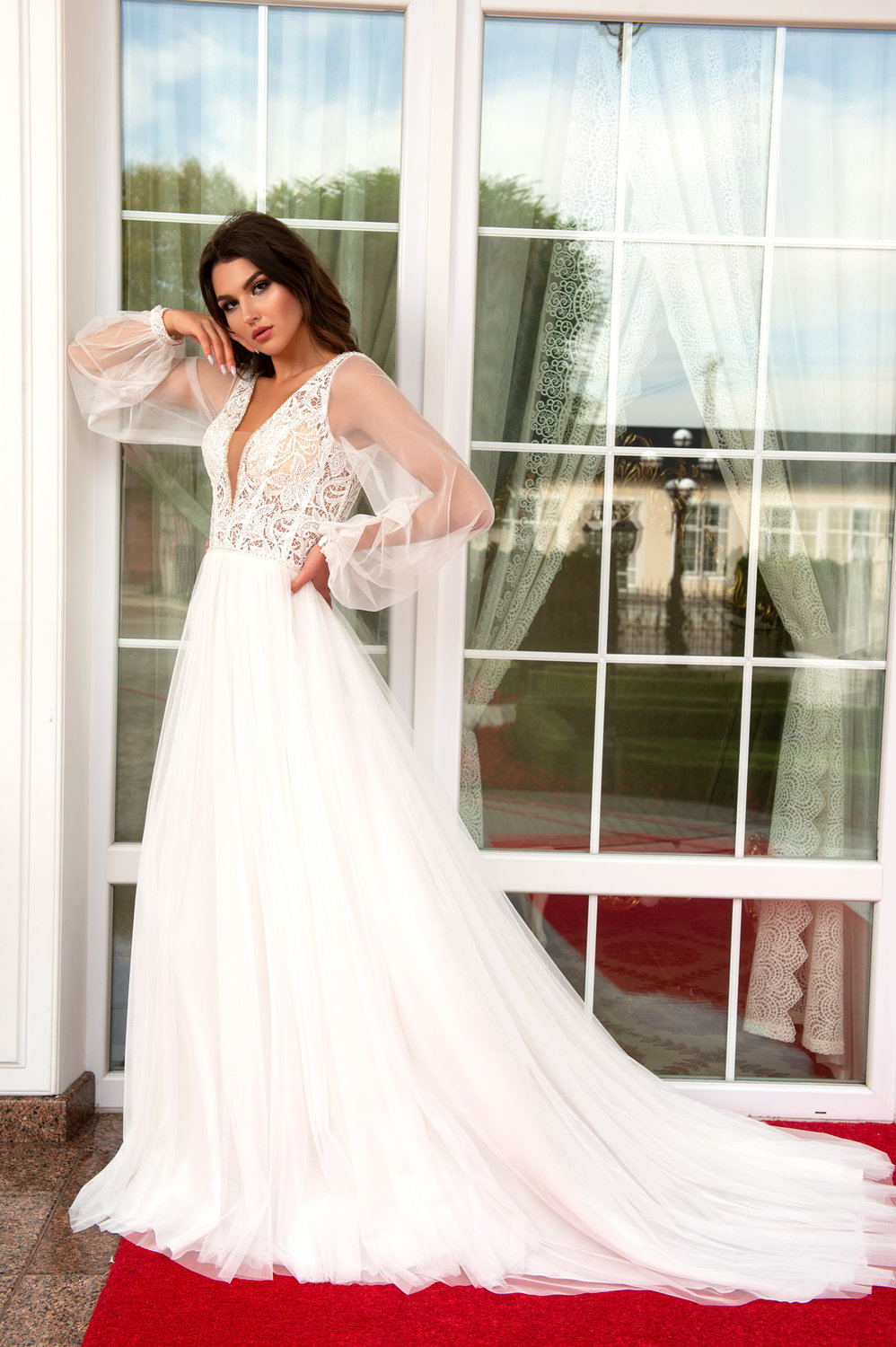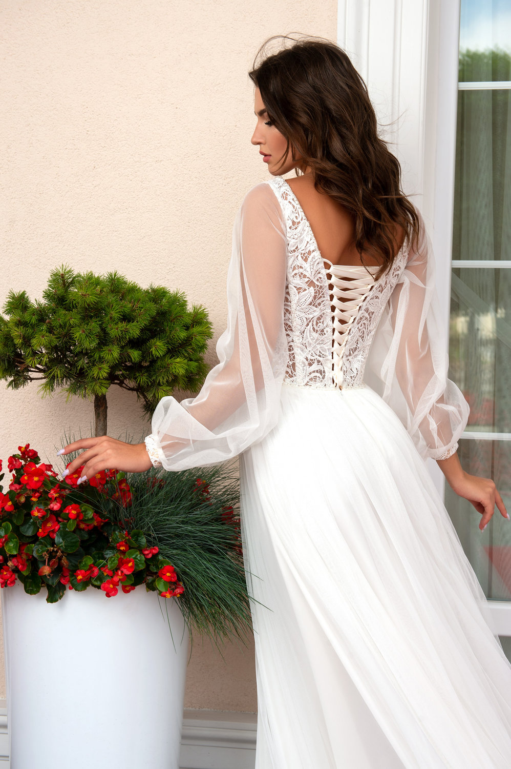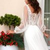 Das Spitzenoberteil mit tiefem V-Ausschnitt und feinen Applikationen verleiht dem Kleid eine feminine Silhouette und unterstreicht die Figur der Braut auf stilvolle Weise. Die langen, transparenten Ärmel sind aus feinem Tüll gefertigt und enden in zarten Manschetten, die dem Look eine leichte Vintage-Note verleihen. Besonders praktisch und schön zugleich ist die Schnürung am Rücken, die nicht nur dekorativ ist, sondern eine perfekte Anpassung an die Körperform ermöglicht.