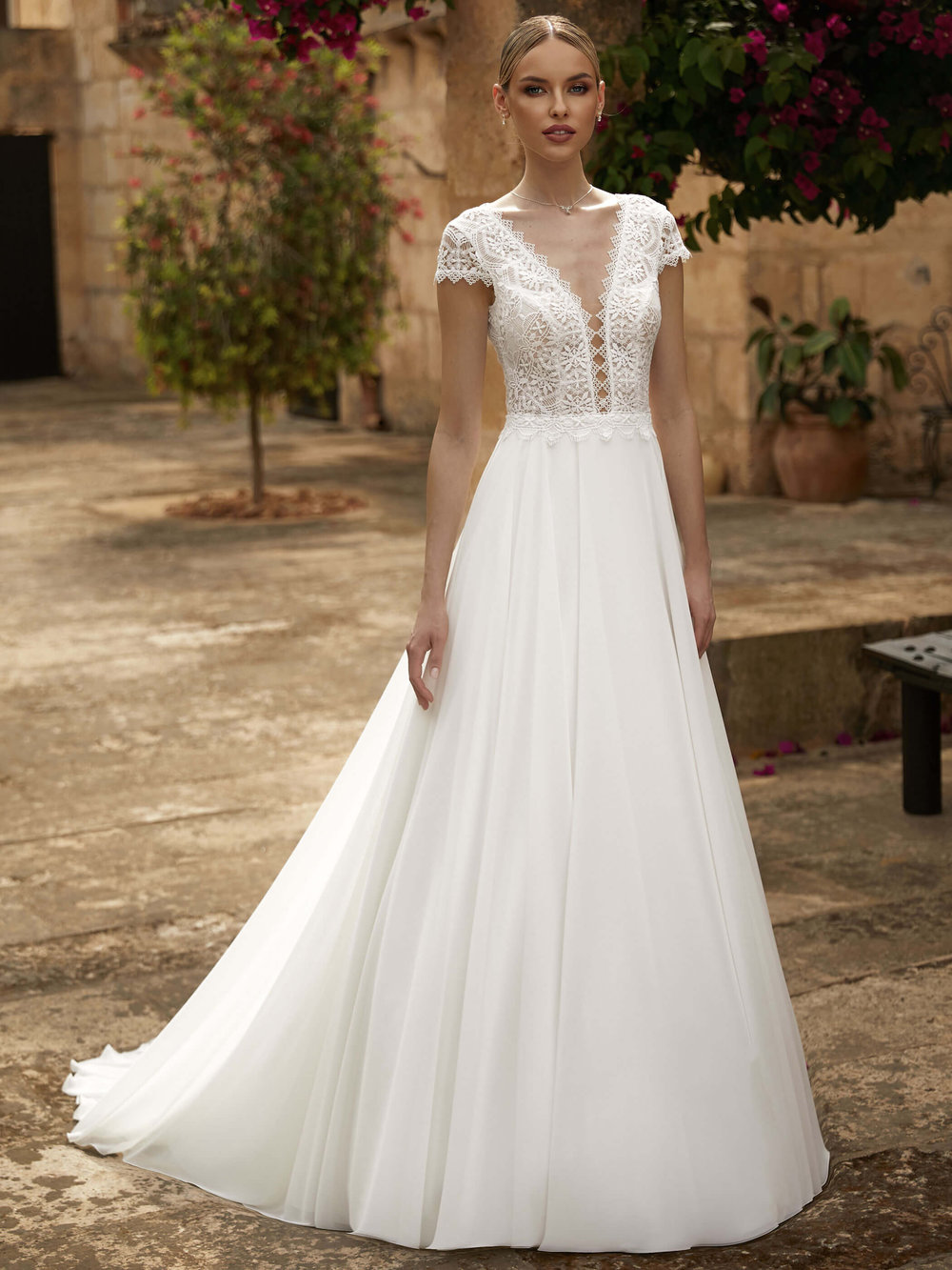 Boho & Vintage Brautkleid mit romantischer Spitze und zartem Chiffonrock in A-Linie – dieses elegante Hochzeitskleid vereint zeitlose Romantik mit modernem Boho-Charme. Das Oberteil ist aus feinster floraler Spitze gefertigt und überzeugt mit einem tiefen V-Ausschnitt, der das Dekolleté stilvoll betont. Die feinen Spitzenärmelchen umspielen die Schultern und sorgen für eine feminine Silhouette.