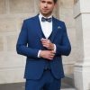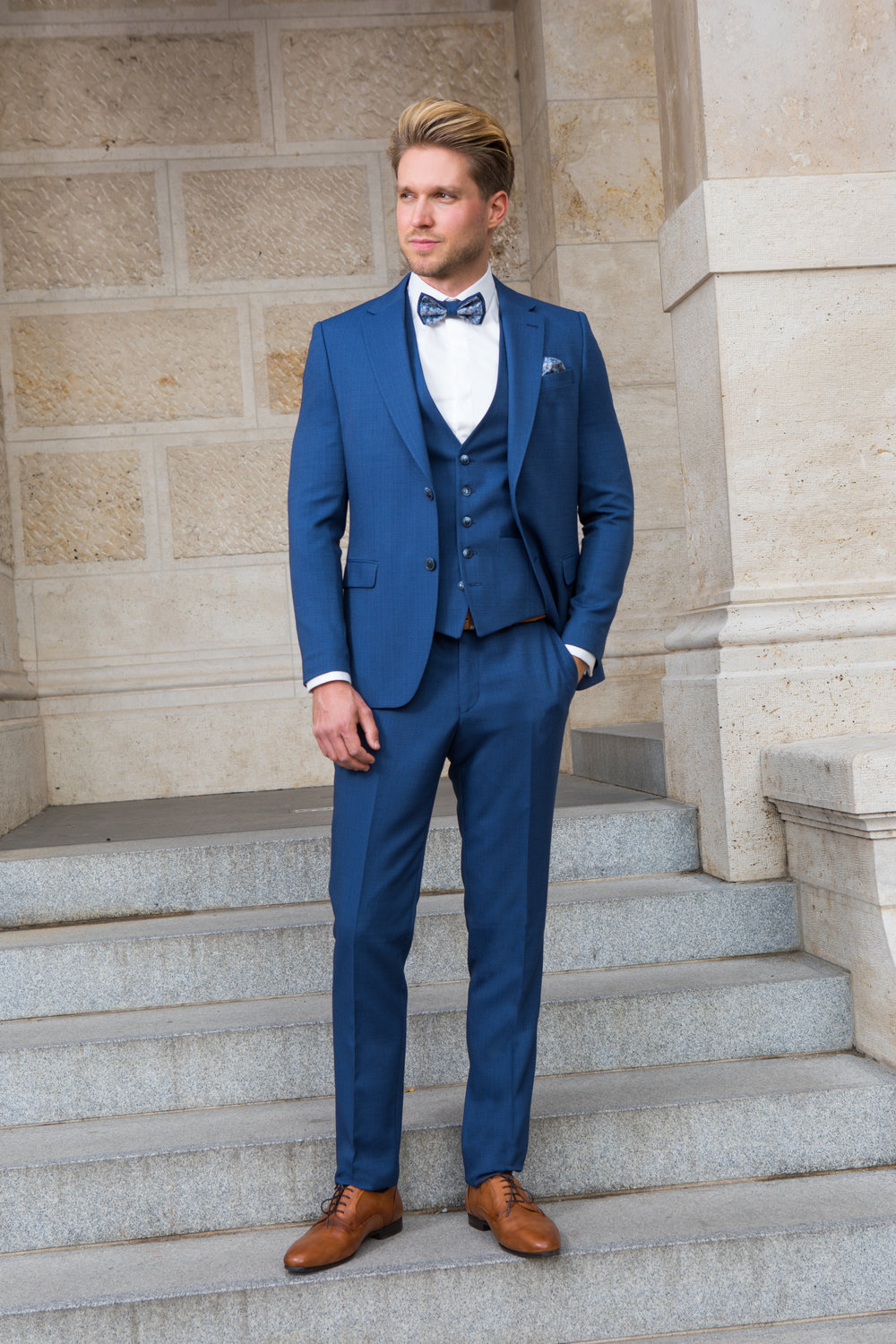 Der fein geschnittene Anzug besteht aus einem hochwertigen Sakko mit schmalem Revers, einer passenden Weste und einer schmal geschnittenen Hose. Das kräftige Königsblau verleiht dem Look eine edle, aber moderne Ausstrahlung und hebt sich elegant vom klassischen Schwarz ab. In Kombination mit dem weißen Hemd und der dunkelblauen Fliege entsteht ein harmonisches Farbkonzept, das sowohl bei Tages- als auch bei Abendhochzeiten überzeugt.
