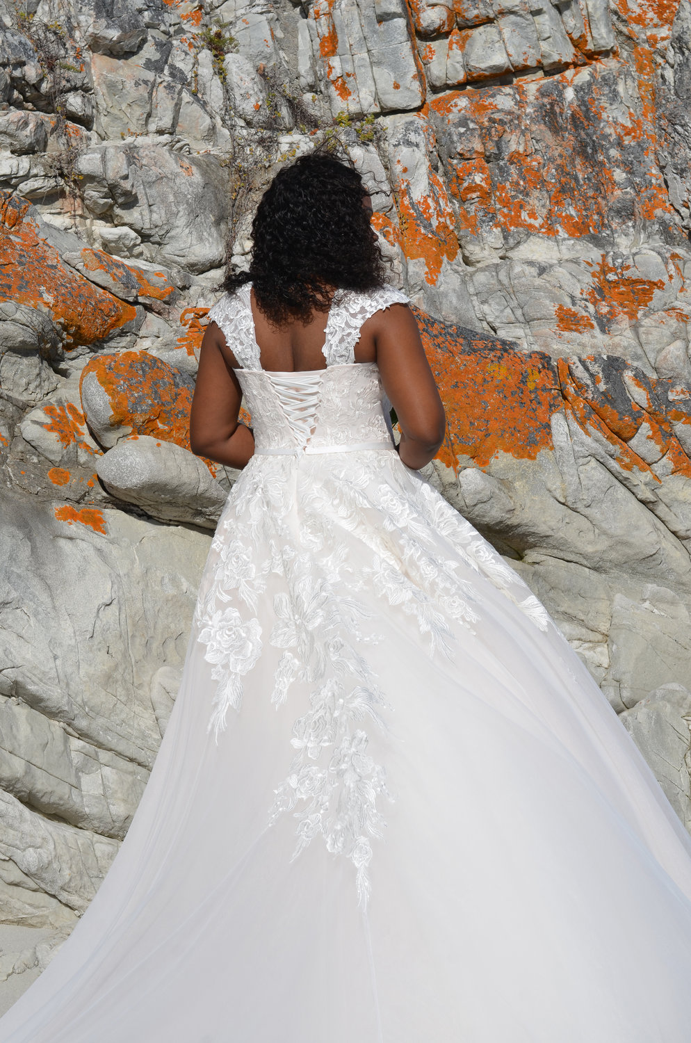 Romantisches Curvy Brautkleid mit Spitze, Schnürung und Tüllrock – figurbetont, bequem und zauberhaft für deinen großen Tag.