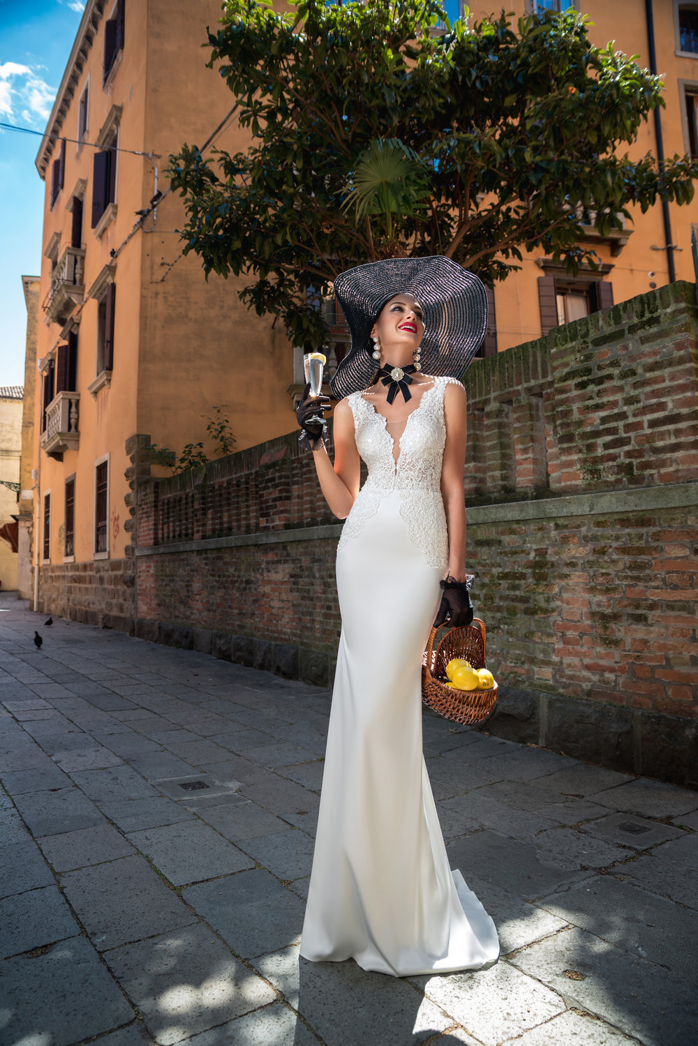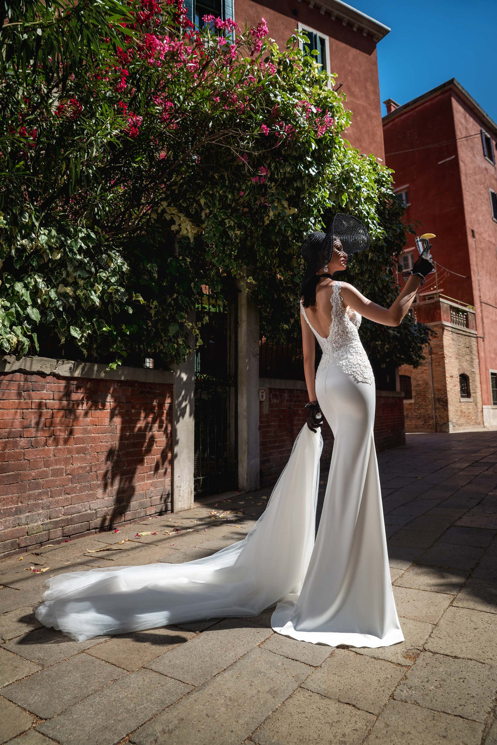 Das Oberteil aus zarter Spitze wird durch einen tiefen V-Ausschnitt vorn und einen verführerischen tiefen Rückenausschnitt ergänzt, der mit einem dezent eingearbeiteten Reißverschluss geschlossen wird. Feine Träger betonen die Schulterpartie und sorgen für sicheren Halt. Das Kleid ist wie geschaffen für eine urbane Hochzeit, eine Feier unter südlicher Sonne oder ein stilvolles Standesamt-Outfit.