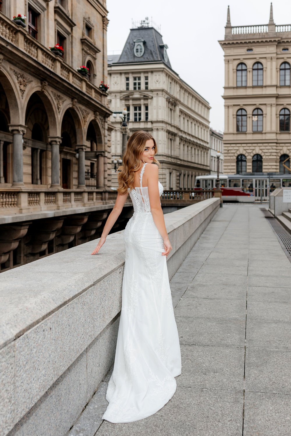 Der Rockteil des Kleides verläuft ab dem Oberschenkel in eine sanfte A-Linie mit leichter Schleppe, die jeder Bewegung eine anmutige Dynamik verleiht. Der zarte Glanz der Stoffe und die schmeichelnde Linienführung machen dieses Brautkleid nicht nur zu einem optischen Highlight, sondern auch zu einem echten Wohlfühlstück – ideal für eine freie Trauung, ein Standesamt oder eine elegante Hochzeit mit großem Auftritt.