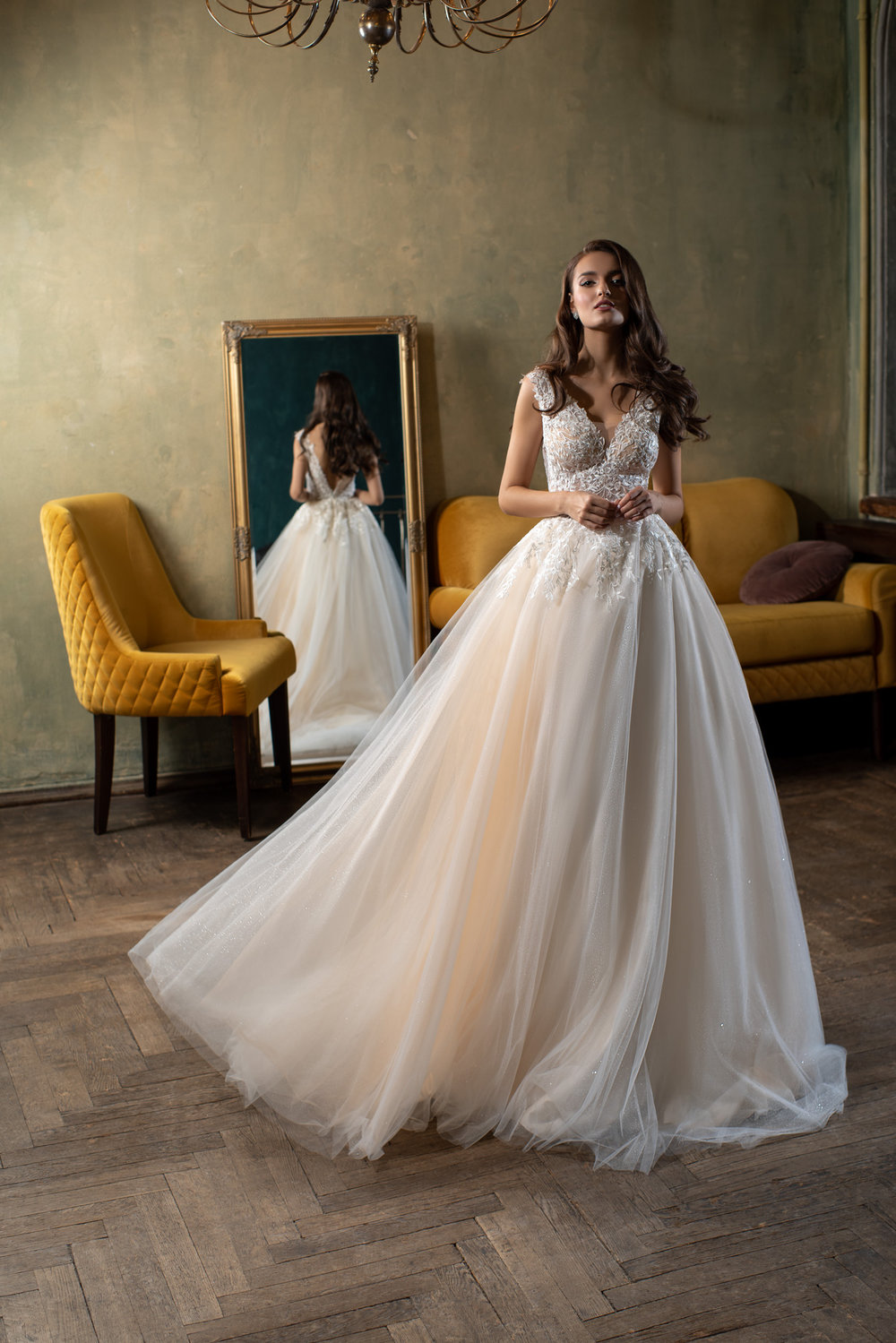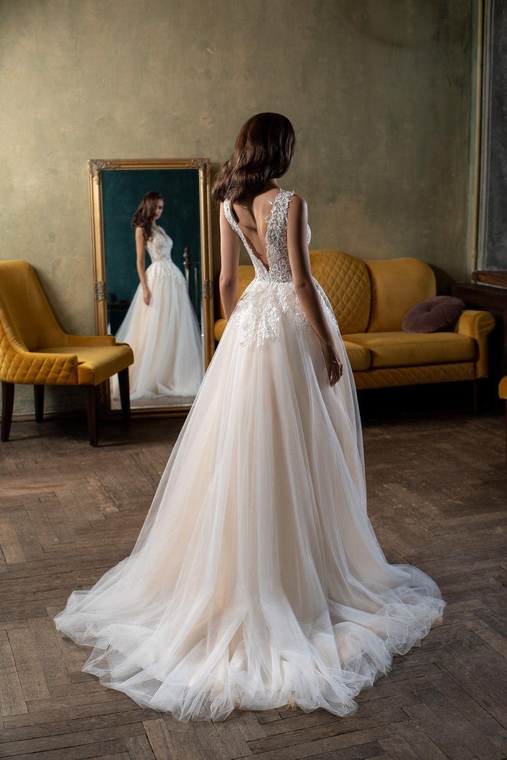 Der Fokus liegt auf dem kunstvoll gearbeiteten Oberteil mit einem tiefen V-Ausschnitt, der die Silhouette wunderbar streckt. Die florale Spitze ist zart auf transparentem Tüll gearbeitet und zieht sich harmonisch über das Corsagen-Mieder. Durch die feinen Träger wirkt das Dekolleté offen, bleibt aber dezent und stilvoll.