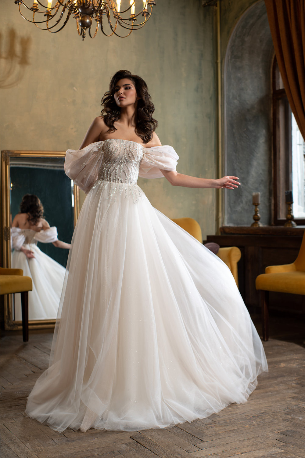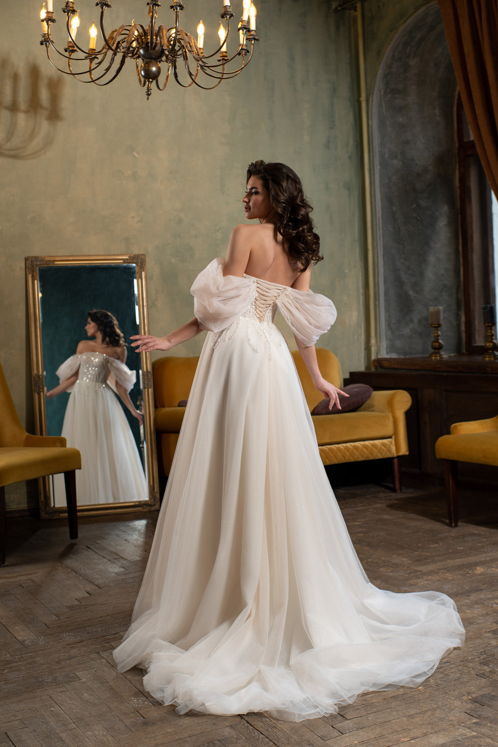 Das Oberteil ist mit funkelnden Pailletten und feinen Glitzerfäden verziert, die bei jeder Bewegung lichtreflektierende Effekte erzeugen. Der Herz-Ausschnitt betont das Dekolleté und verleiht dem Kleid einen femininen und eleganten Ausdruck. Die off-shoulder Puffärmel lassen sich optional abnehmen und ermöglichen somit zwei verschiedene Looks – verspielt oder klassisch.