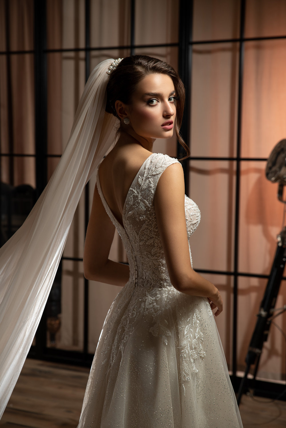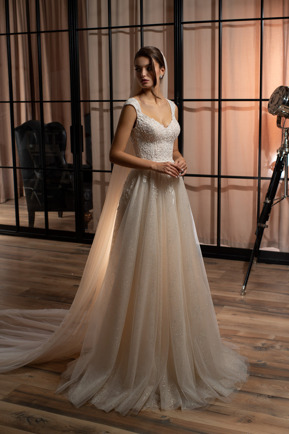 Der mehrlagige Tüllrock in A-Linie verleiht dem Kleid einen fließenden, voluminösen Fall und sorgt für einen märchenhaften Auftritt. Die integrierten Glitzerelemente im Rock reflektieren das Licht bei jeder Bewegung und erzeugen einen dezenten Schimmer – perfekt für eine romantische Trauung oder einen eindrucksvollen Eröffnungstanz.