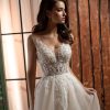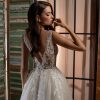 Besonderes Augenmerk verdient der fein glitzernde Tüllrock, der durch seine luftige Struktur jedem Schritt Leichtigkeit verleiht und eine wunderschöne Silhouette schafft. Der fließende Fall der Stoffe und die edlen Applikationen sorgen für ein besonders elegantes Gesamtbild, das in jeder Location – ob Schloss, Weingut oder Boho-Hochzeit im Freien – zur Geltung kommt.