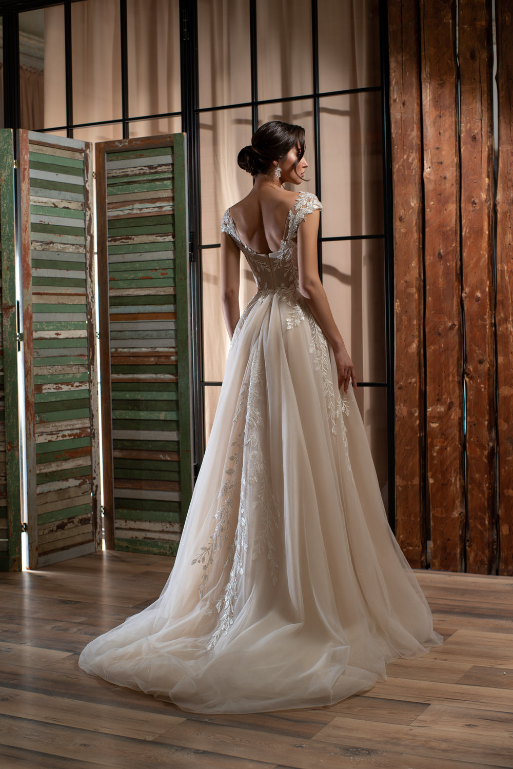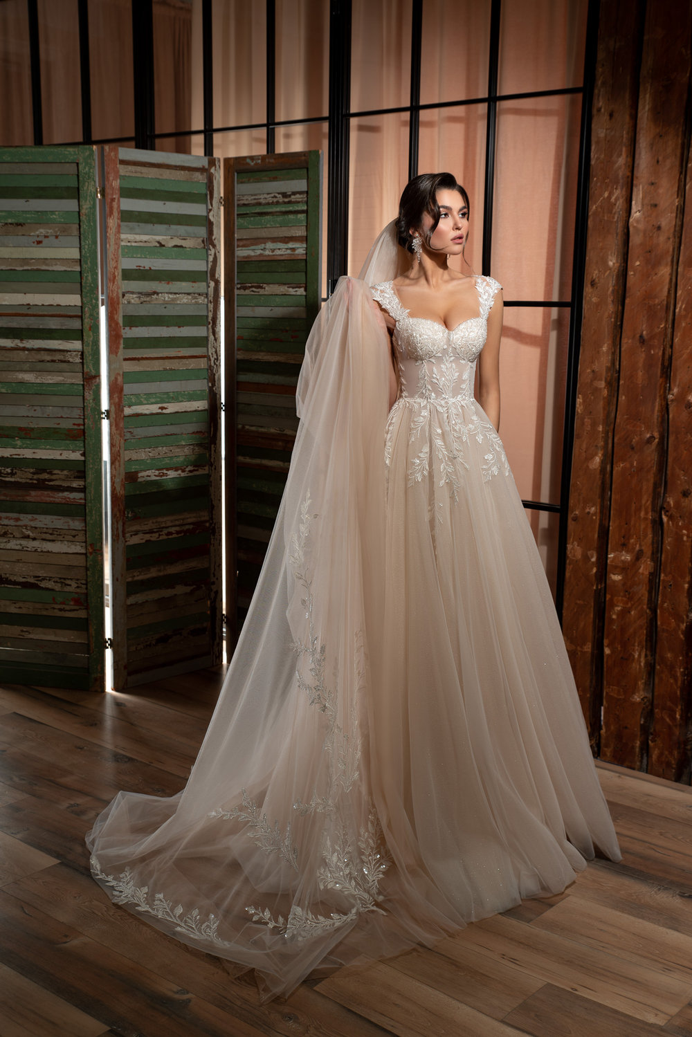 Der weich fallende Rock mit ausgestellter A-Linie ist mit mehreren Lagen Tüll versehen, die dem Kleid Volumen und Leichtigkeit verleihen. Die lange Schleppe mit feinen Glitzerdetails ergänzt den edlen Look perfekt – für einen unvergesslichen Auftritt beim Einzug in die Zeremonie. Die Verarbeitung eignet sich auch hervorragend für Indoor-Hochzeiten, Abendveranstaltungen und glamouröse Empfangsmomente.