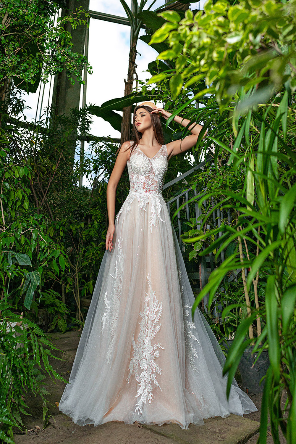 Dieses außergewöhnlich elegante Brautkleid verkörpert moderne Romantik in ihrer reinsten Form. Mit einem transparenten Mieder, feinen Trägern und detailverliebten floralen Applikationen ist es ein Highlight für jede Braut, die sich stilvoll, sinnlich und einzigartig präsentieren möchte. Die Kombination aus floraler Spitze, zartem Tüll und leichter Transparenz macht dieses Kleid zu einem absoluten Hingucker – nicht nur vor dem Altar, sondern auch auf Fotos.