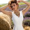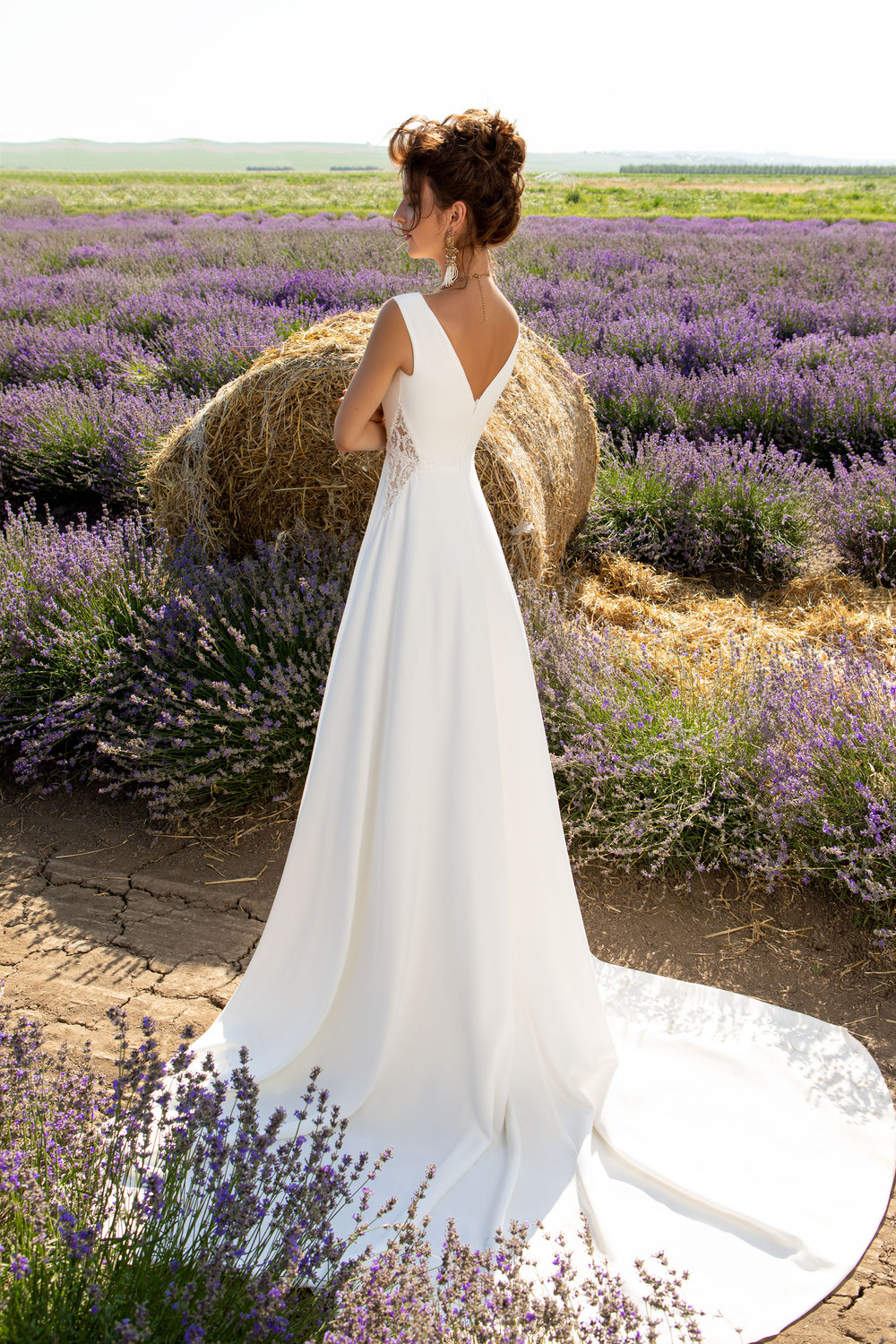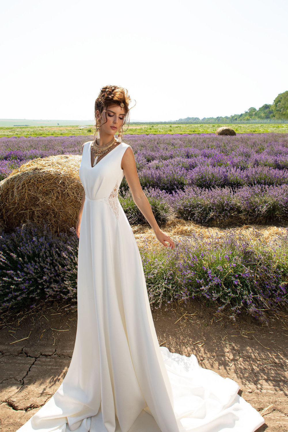 Das Design dieses Kleides kombiniert klassische Eleganz mit einem modernen Twist: Ein tiefes V-Dekolleté verleiht dem Oberteil eine feminine Silhouette, während die A-Linie für einen sanften, fließenden Fall des Rocks sorgt. Der Clou sind die seitlichen Cut-Outs, die mit zarter Spitze unterlegt sind. Diese verleihen dem Kleid einen raffinierten und gleichzeitig romantischen Charakter – perfekt für Bräute, die das gewisse Etwas suchen, ohne zu übertreiben.