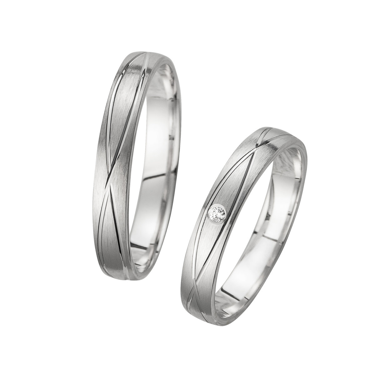 Die Oberfläche beider Ringe ist fein mattiert, wodurch die geschwungene Rillenstruktur besonders gut zur Geltung kommt. Im Damenring sitzt ein funkelnder Brillant exakt im Schnittpunkt der Linienführung – als Symbol für den einen Moment, in dem sich zwei Wege kreuzen und eins werden. Der Herrenring bleibt schlicht, aber kraftvoll im Ausdruck, was die perfekte Balance zwischen Zurückhaltung und Design schafft.