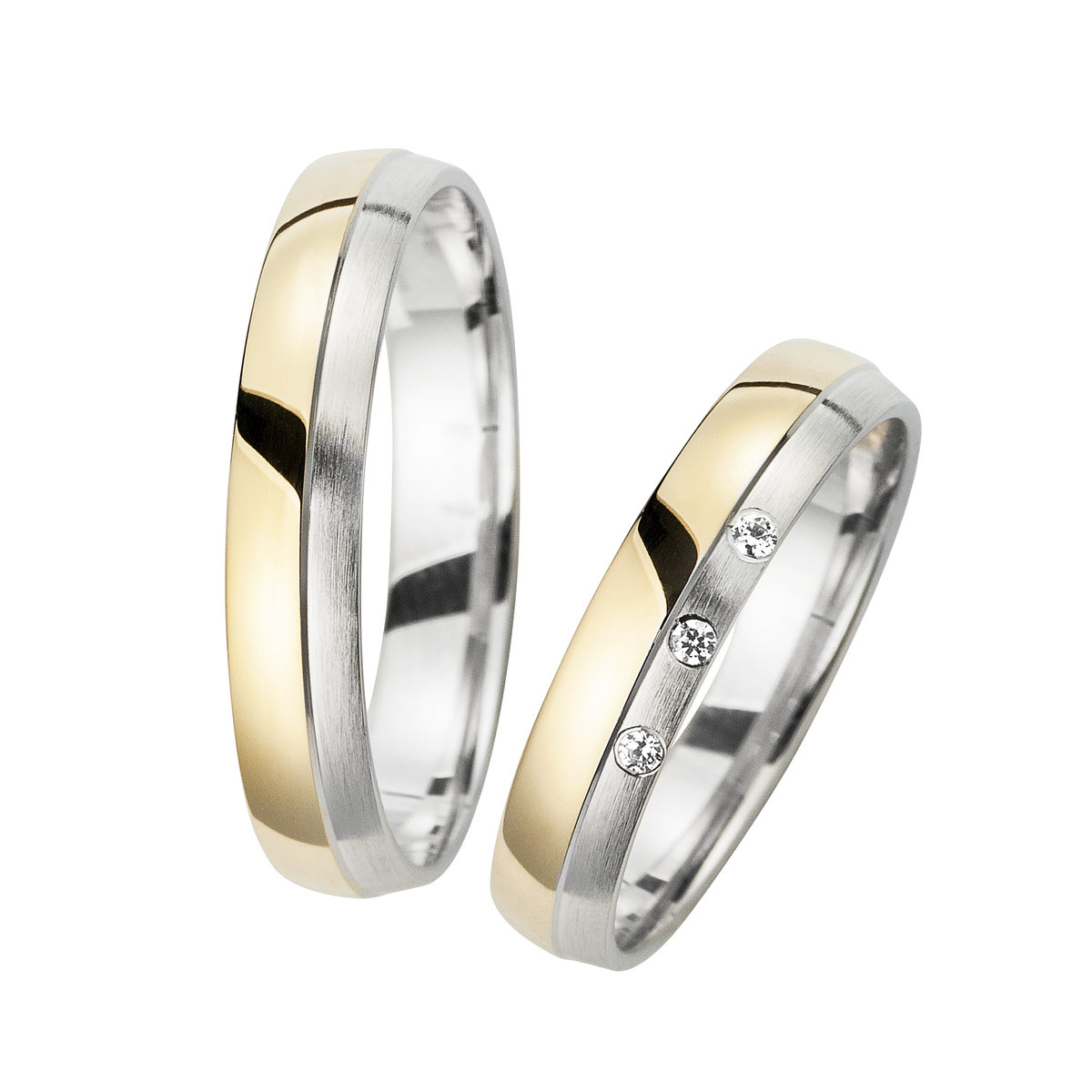 Trauringe mit Weiß- und Gelbgold – moderne Eheringe mit matter Oberfläche und funkelnden Brillanten verbinden klassische Eleganz mit einer zeitgemäßen Formensprache. Dieses wunderschöne Ringpaar ist die perfekte Wahl für Paare, die auf hochwertige Materialien, schlichte Linienführung und eine stilvolle Optik setzen.