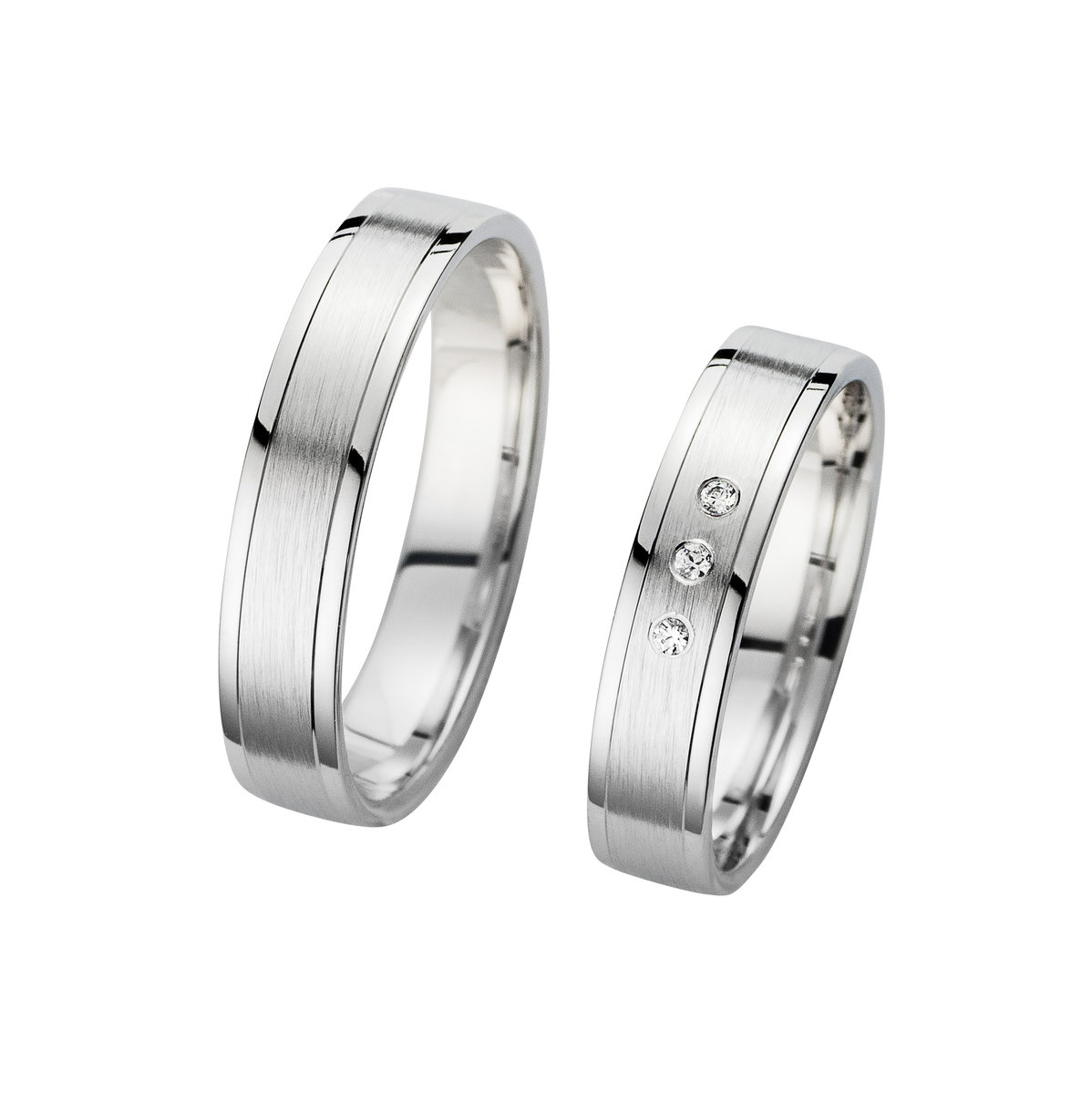 Der Damenring ist mit drei filigran eingefassten Brillanten geschmückt. Die Steine sind versetzt platziert und fügen sich elegant in das reduzierte Design ein. Sie sorgen für ein subtiles Funkeln, das den Ring feminin akzentuiert, ohne dabei aufdringlich zu wirken. Der Herrenring ist bewusst schlicht gehalten und bietet eine perfekte Ergänzung für ein harmonisches Trauringpaar.