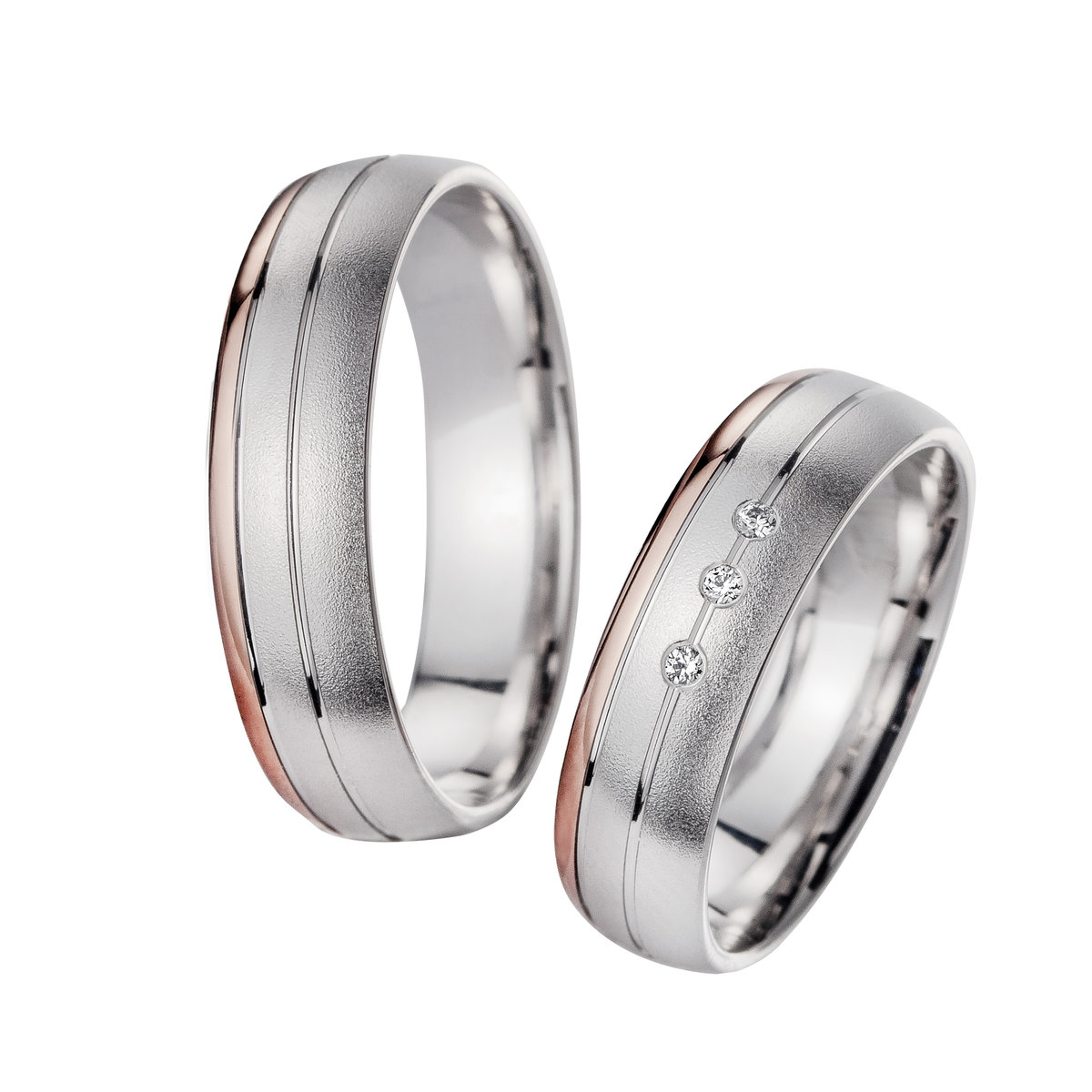 Elegante Trauringe aus Weißgold mit feinem Roségold-Einsatz. Der Damenring wird von drei filigranen Brillanten geschmückt – perfekt für Paare mit Sinn für dezente Raffinesse.