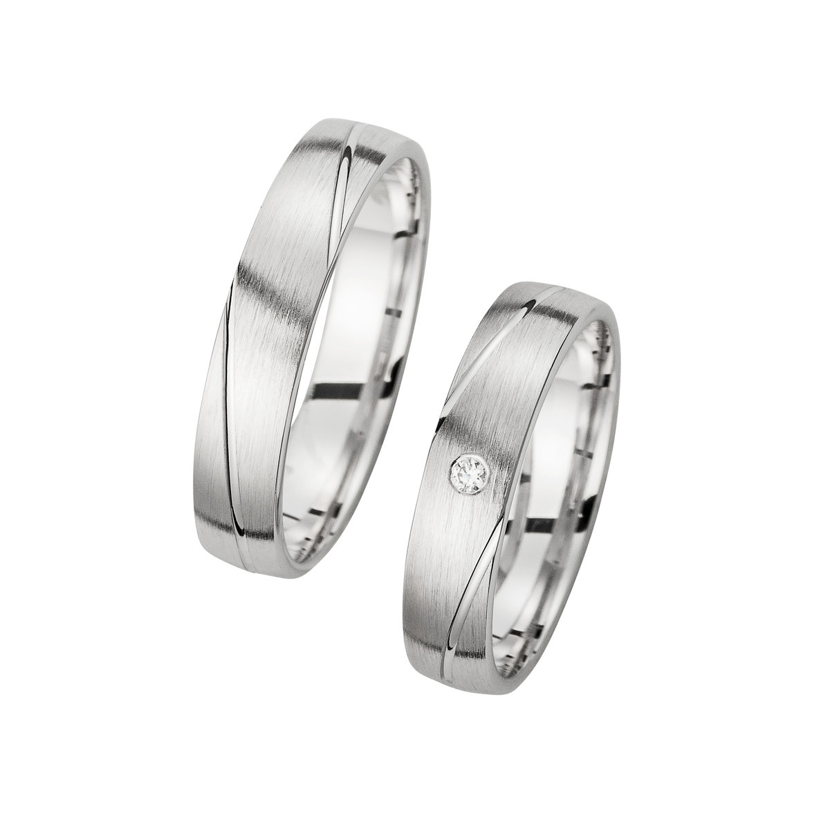 Elegante Trauringe aus Weißgold mit moderner Linienführung und Diamantbesatz sind die ideale Wahl für Paare, die auf schlichte Eleganz und stilvolle Details setzen. Dieses Trauringpaar besticht durch ein klares Design mit fein mattierter Oberfläche und markanter, geschwungener Linienführung, die sich harmonisch über beide Ringe zieht.