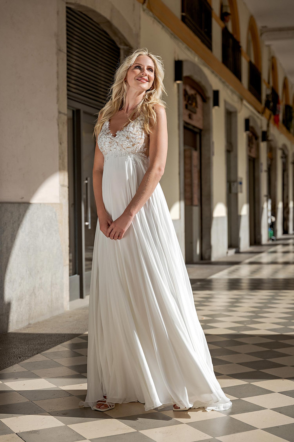 Wenn du ein Kleid suchst, das deine Schwangerschaft unterstreicht und dich an deinem Hochzeitstag strahlen lässt, ist dieses Modell die perfekte Wahl.